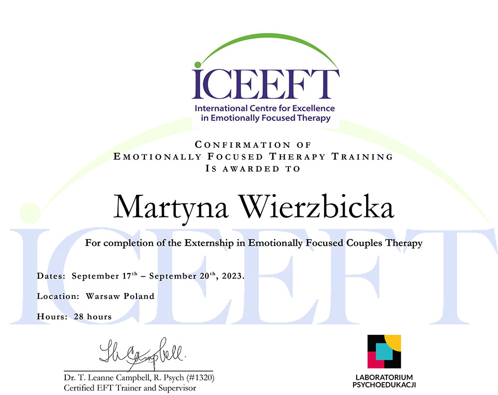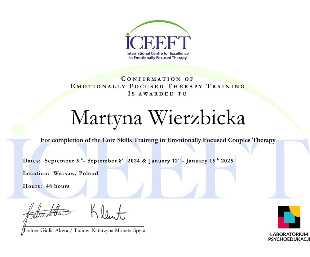 Terapię par prowadzę w nurcie EFT: Terapii Skoncentrowanej na Emocjach.