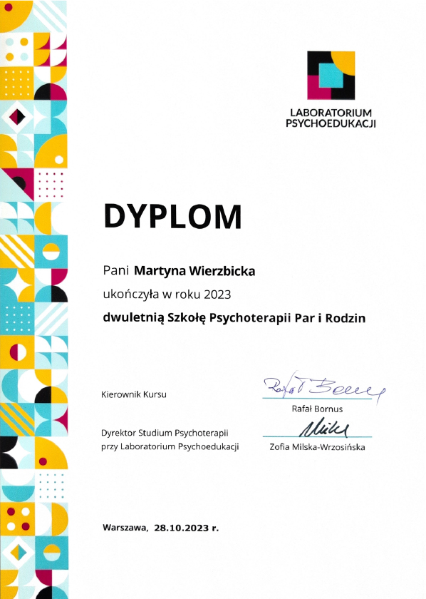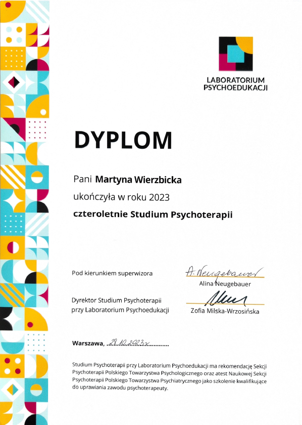 Jestem psychoterapeutką psychodynamiczną, psychologiem (min. SWPS Warszawa, Laboratorium Psychoedukacji), a swoje kompetencje rozwijam na szkoleniach i kursach. Jako psychoterapeuta podlegam też profesjonalnej superwizji.